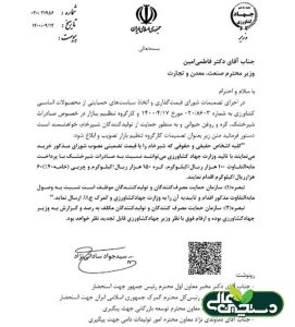 “کلیه اشخاص حقیقی و حقوقی که شیرخام را با قیمت تضمینی مصوب شورای مذکور خرید مینمایند با تایید وزارت جهاد کشاورزی میتوانند نسبت به صادرات شیر خشک با پرداخت مابهالتفاوت 100 هزار ریال/کیلوگرم، کره 150 هزار ریال/کیلوگرم و چربی (خامه 40%) 60 هزار ریال/کیلوگرم اقدام نمایند.